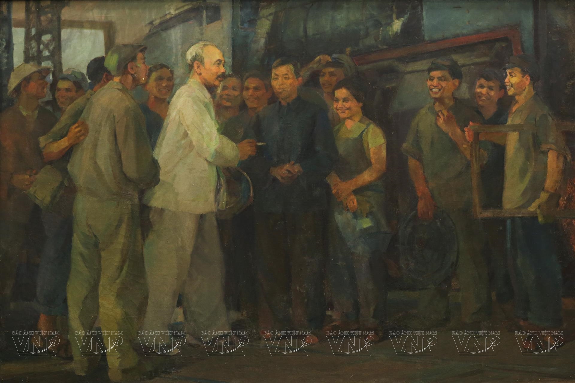 Tác phẩm Bác Hồ với công nhân xe lửa Gia Lâm của tác giả Phạm Lung.